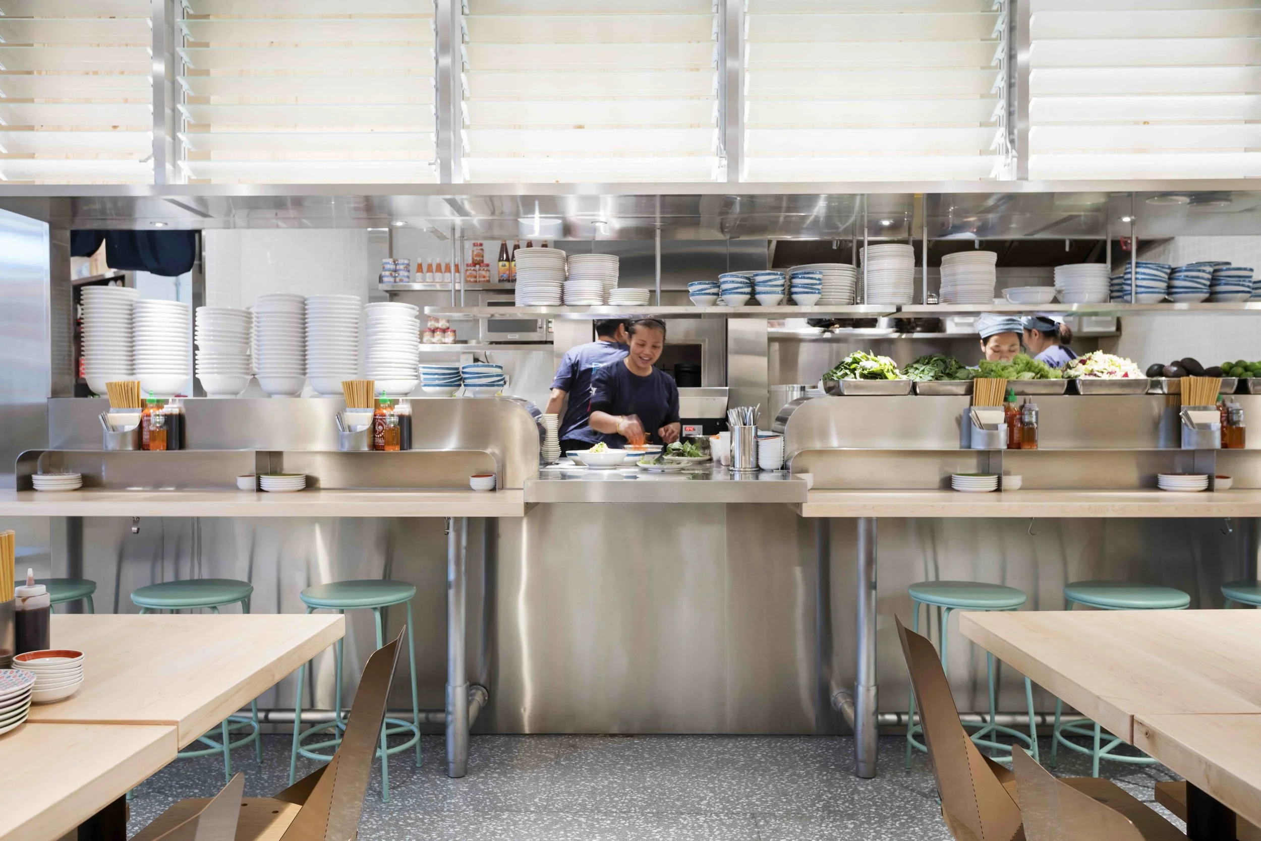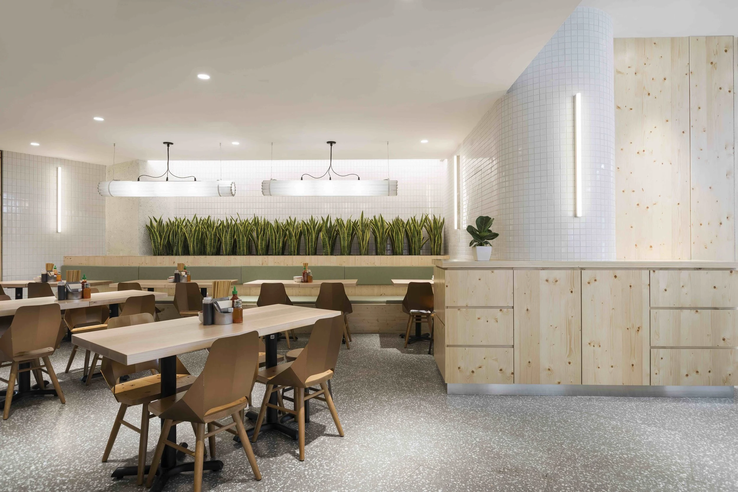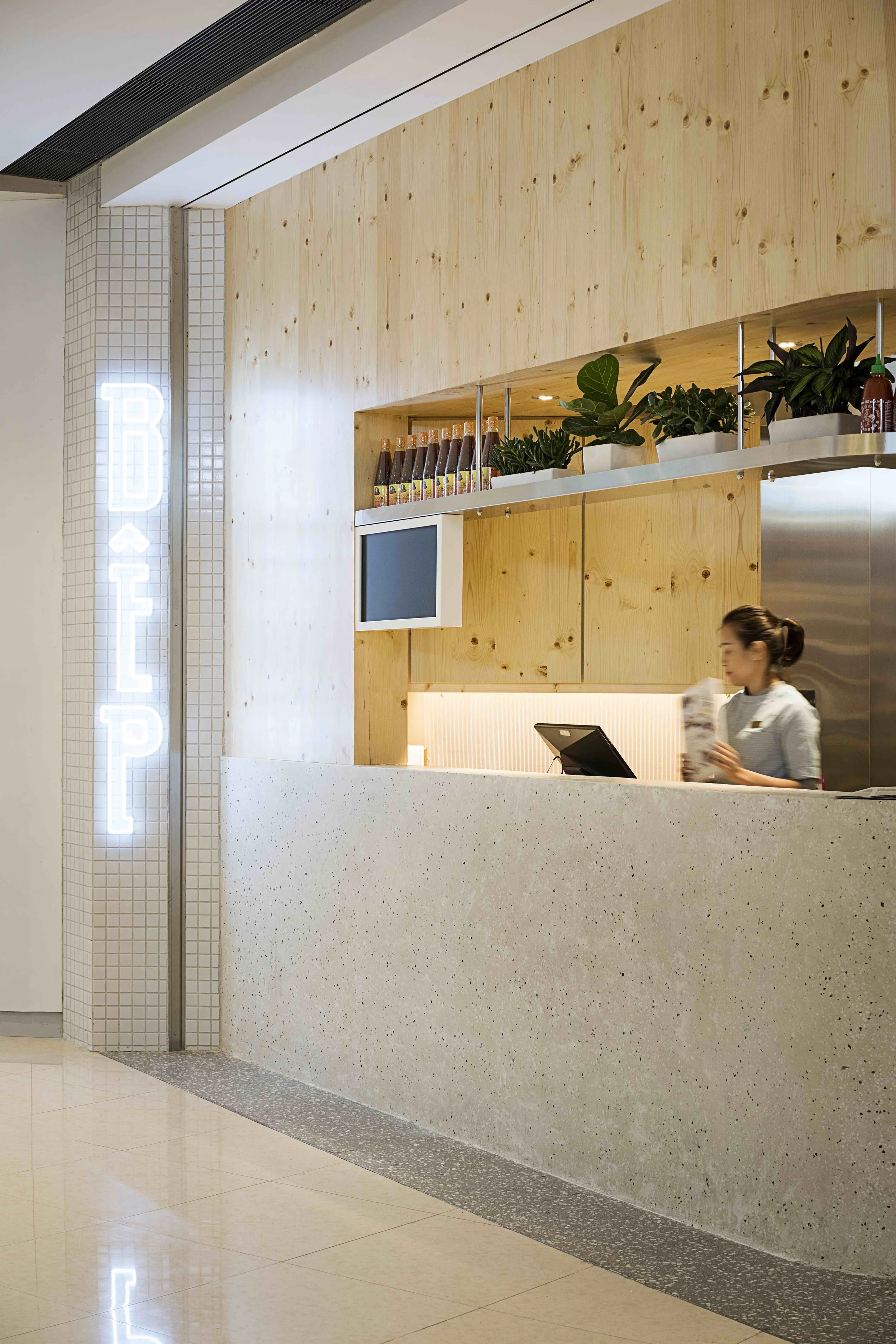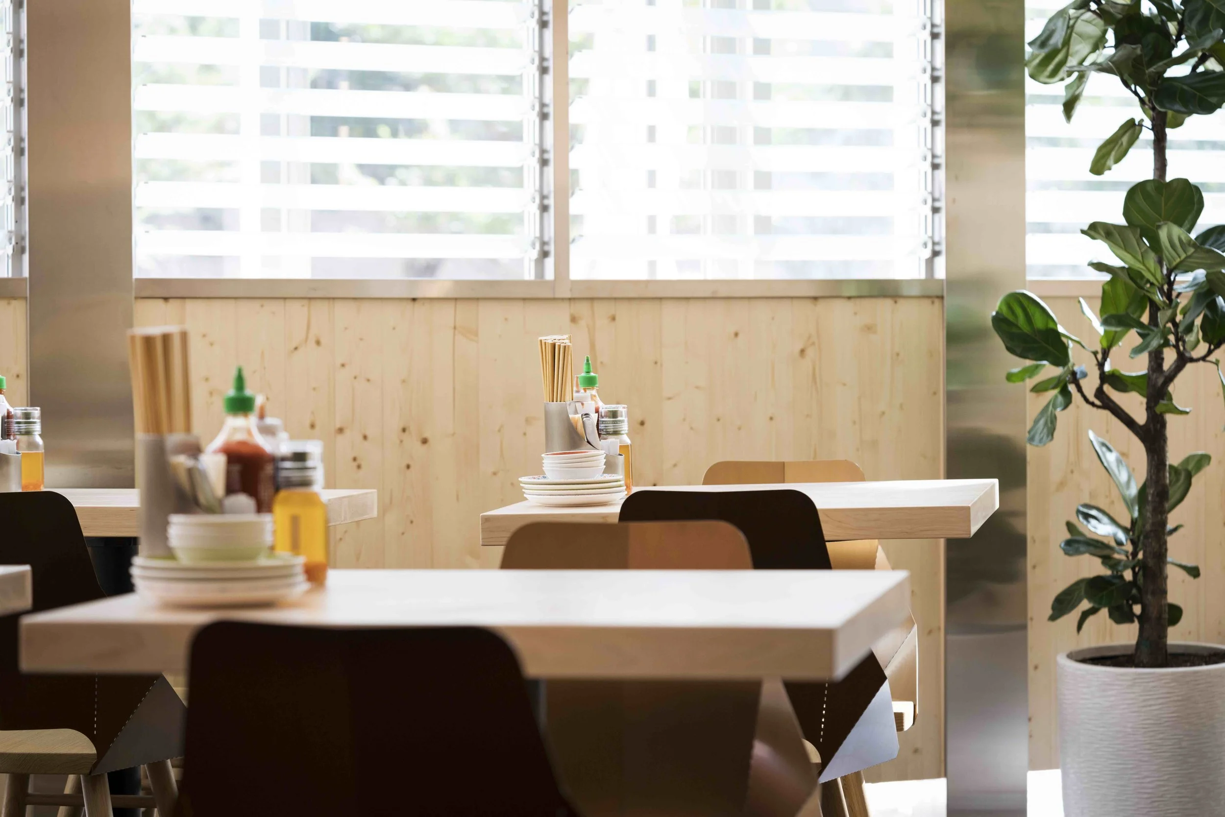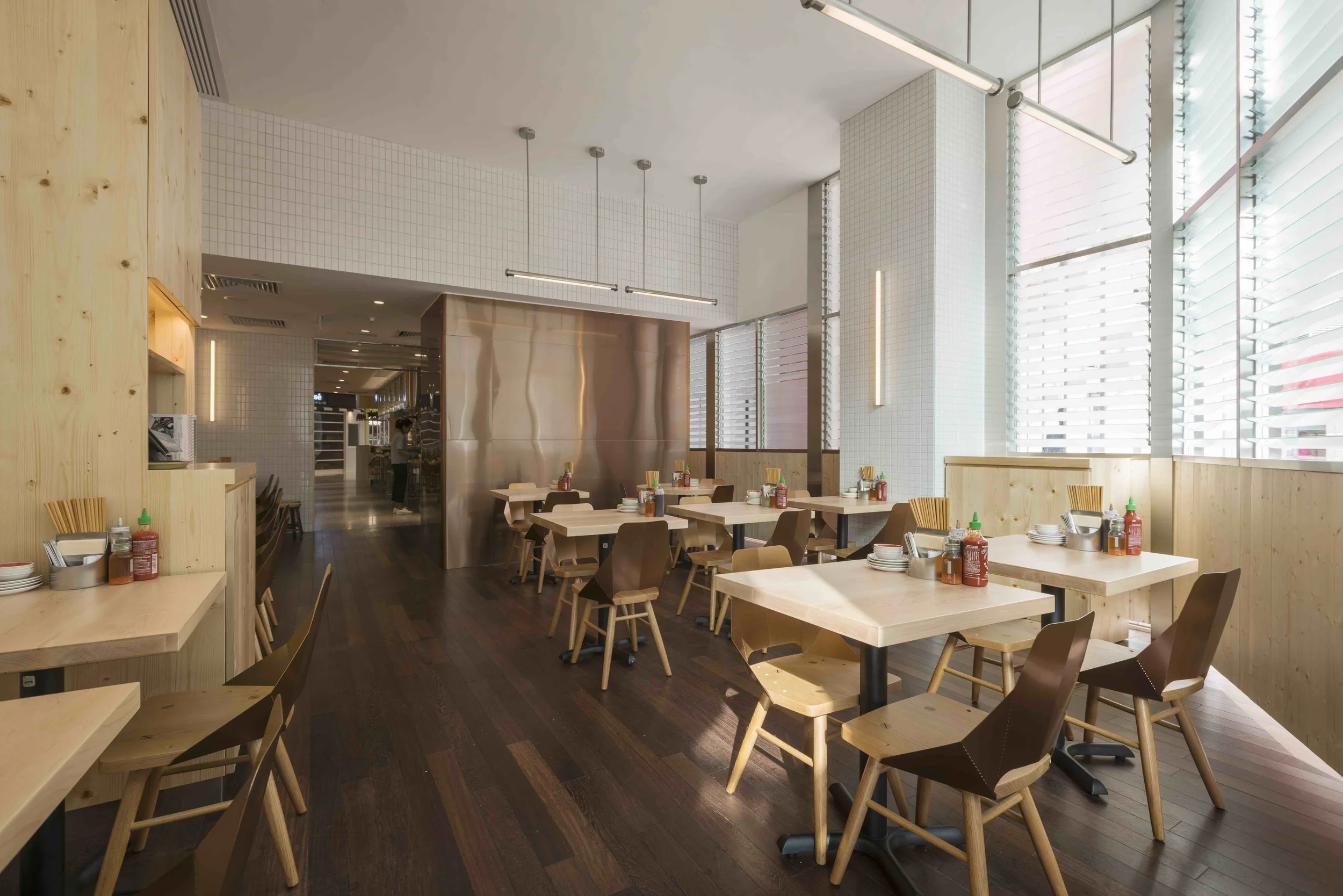 A first for the restaurant, JJA / Bespoke Studio, utilities pivoting glass blinds to create an architecture that is unique to brand, while helping separate the restaurant from the harsh shopping mall's shell. Hard-wearing and low-maintenance plants were also added to give a sense of warmth and domesticity to the interior space.