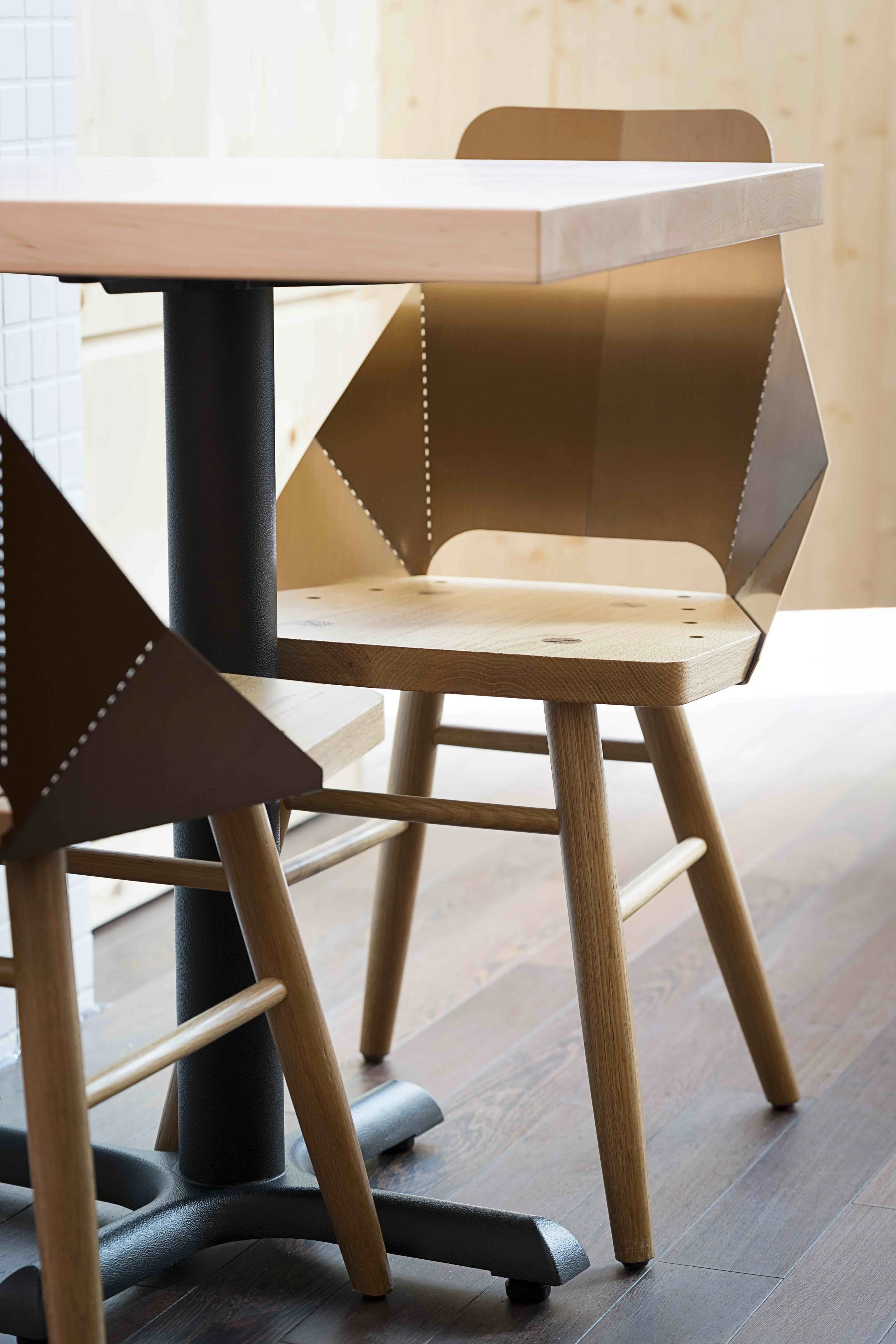 The studio's goal was to create a journey of intimate spaces from the mall's interior corridor to the outdoor seating area on the shop's street side, while keeping the brand's preferred colours and material choices.