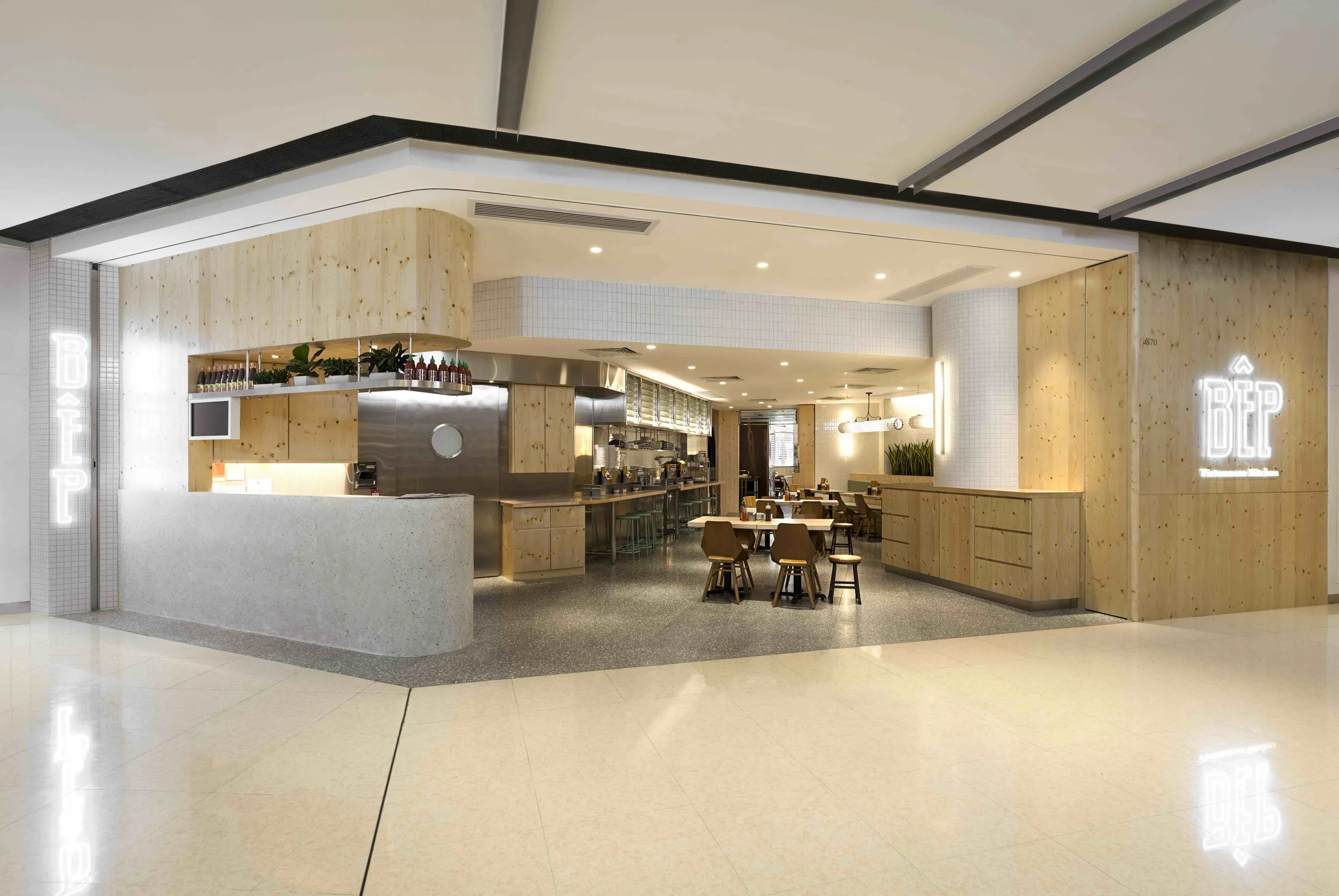 BÊP Olympian City brings Hong Kong's edgy Vietnamese cuisine brand from Central, across the harbour, to Kowloon - catering a market looking for casual, fresh, and easy Vietnamese fare. JJA / Bespoke Studio adopted the brand's existing interior concept for its largest site yet - set street side within a vast mixed-use development of shops and high-rise residences, typical of the Hong Kong context.